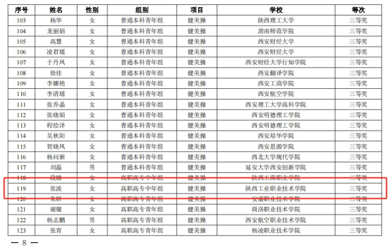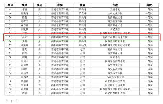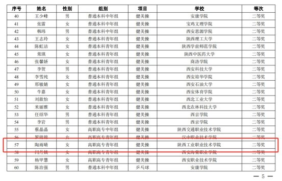 10月26日—27日,陕西省高校体育教师教学技能大赛在西安交通大学兴庆校区举行。本次赛事由陕西省教育厅主办,西安交大承办,是全省体育教师教学水平和技能展示的最高赛事。我校教师吕方荣获乒乓球项目一等奖,陶雨晴荣获健美操项目二等奖,张波、高波分别荣获健美操和足球项目三等奖,取得该项赛事成绩的新突破。